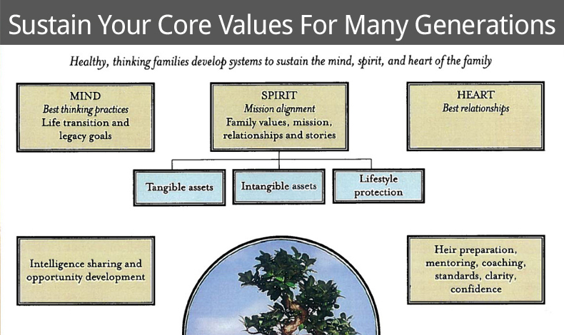 Generational Succession Systems Help Sustain Family Core Values Below are the eight areas of a legacy planning estate plan that create a strong and healthy structure upon which your family can build long-term success: (Click links to scroll down for more information.) Family Education Family Philanthropy Family History & Resources Family Reunions Family Financial Health…